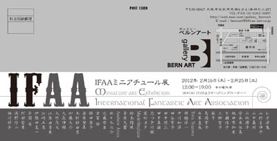 IFAA ミニアチュール展 ギャラリー ベルンアート 〒530-0047 大阪府大阪市北区西天満4-2-4(美術ビル2F) TEL / FAX 06 - 6361 - 5507 http://web.mac.com/gallery_bernart 2012年2月16日(木) 〜 2月25日(土) 12:00〜19:00 日曜休廊 相川祥吾 浅野信二 阿部哲夫 井関周 伊豫田晃一 江崎五恵 江原由香里 大竹茂夫 大森伸樹 加藤大介 木村紗由香 桑原聖美 櫛田康子 古賀郁 近藤宗臣 佐々木六介 Andrew Jones 菅原天齎 鈴木陽風 Marie-Stephane 高松ヨク たつき川樹 田中章滋 田中照三 田谷京子 中川知洋 根橋洋一 Tooru Nogawa 白翠皇夜 馬場京子 麻子 三柳智子 百瀬靖子 桃田有加里 安本亜佐美 山地博子 山中義明 山村まゆ子 レオ澤鬼 ブログ記事 会場風景・フェイスブック |