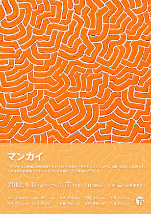 マンカイ 2012 2012 年 4 月 11 日(水)〜17 日(火)*会期中無休 am11:30-pm7:30 14日(土)18:00pm オープニングパーティー 青山祐功(洋画)高木優子(日本画)東条香澄(版画) 中川知洋(洋画)中村公之(立体)古澤洋子(日本画) 松永 賢(洋画)武藤邦弘(洋画)山村國晶(洋画) 吉島信広(立体) 万(よろず)画廊 〒104−0061東京都中央区銀座 1 丁目23−2 GINZA上野ビル1F TEL/FAX 03−5250−3667 http://www.yawoyorozu.com/ ブログ記事 会場風景・フェイスブック |