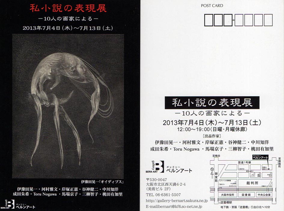 会場:ギャラリーベルンアート 〒530-0047 大阪市北区西天満4-2-4美術ビル2F TEL 06-6361-5507 会期:2013年7月4日(木)〜7月13日(土) 会場時間:12:00〜19:00(日曜・月曜休廊) URL http://gallery-bernart.sakura.ne.jp/ 出品作家 伊豫田晃一 ・ 河村雅文 ・ 岸塚正憲 ・ 谷神健二 中川知洋 ・ 成田朱希 ・ Toru Nogawa 馬場京子 ・ 三柳智子 ・ 桃田由加里 |