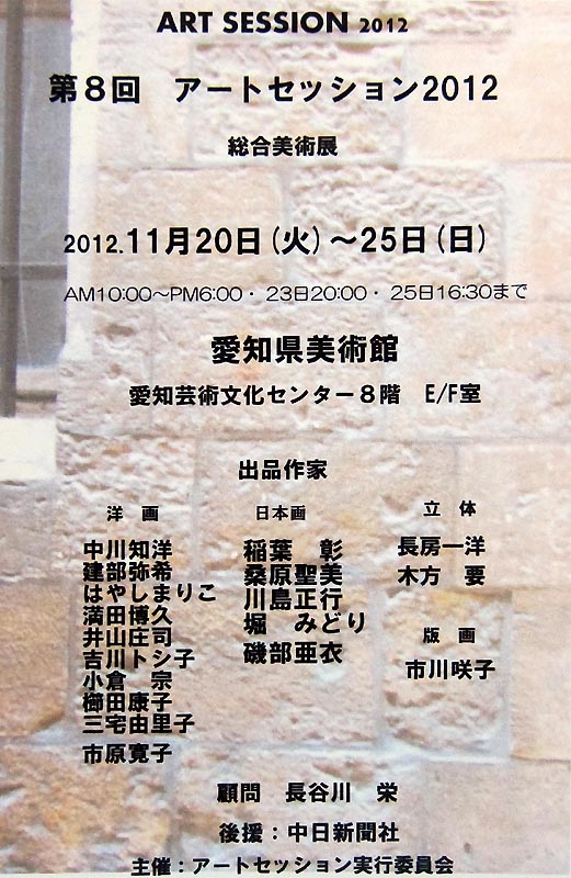 第8回 アートセッション2012 総合美術展 2012.11.20(火)〜25(日) 10:00-18:00(23日20:00、25日16:30まで) [会場] 愛知県美術館 愛知芸術文化センター8階 E・F室 〒461-8525 名古屋市東区東桜1-13-2 [出品作家] 【日本画】 稲葉 彰 桑原聖美 川島正行 堀みどり 磯部亜衣 【洋画】 中川知洋 建部弥希 はやしまりこ 満田博久 井山庄司 吉川トシ子 小倉宗 櫛田康子 市原寛子 【版画】 市川咲子 三宅由里子 【立体】 長房一洋 木方要 |